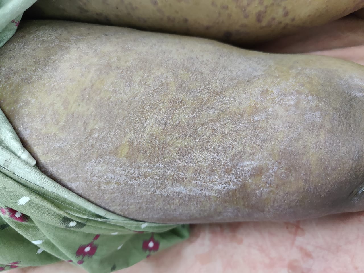 However, her condition was not improving. So, the next day evening (4 days ago), she went to the Suryapet hospital, where she was prescribed doxycycline, sucralfate and lotion, after which the itching deceased but the erythema and rashes remained.