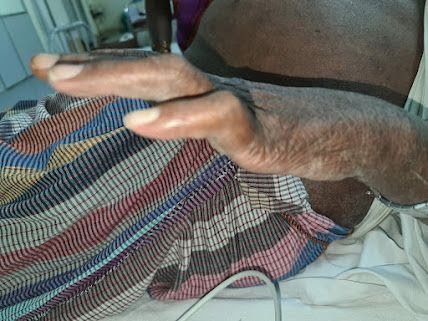 Patient was apparently asymtomatic 25 years back when he started getting joint pains. They started with his right wrist first, followed by right elbow, then left wrist, then left elbow, then cervical joint, then B/L DIP, then B/L PIP, then B/L knee joint, then B/L ankle joint.